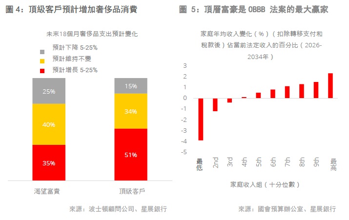OBBB利好「低調奢華」市場。特朗普的「大而美法案」(OBBB)引發了市場對其或會抑制消費支出的擔憂。美國國會預算辦公室強調了該法案利益分配不均的情況,預計此法案將每年為頂層富豪節省2.3%,而底層群體每年或會損失3.9%。這種差別對待加劇了市場對法案或會為整體消費者信心和支出帶來負面影響的擔憂。然而,我們認為該法案對高淨值人群的財富影響甚微,「低調奢華」市場的需求將繼續獲得持續支撐。