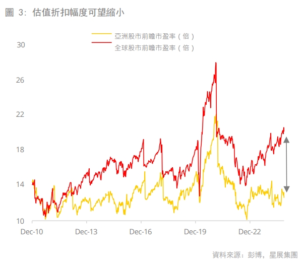 亞洲資產整體表現向來與全球利率呈負相關。隨著利率走勢對亞洲有利,亞股過去表現落後,未來估值有上調(re-rating)機會,特別是權重較高的指數成份股和利率敏感型資產可望有較佳的表現。