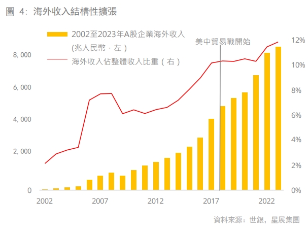 隨著時間推移,中國企業已改善收入多元化和盈利品質。例如,2023年海外收入佔整體收入比率已升至12%,大幅高於2000年時約2%的水平。值得注意的是,儘管2018年初開始實施貿易關稅,海外收入仍進一步擴張。星展集團預期,隨著中國企業透過多元化對外投資、確保全球供應鏈、當地化生產以及進入新興市場藉以提升生產效率和需求,海外貢獻將持續增加。