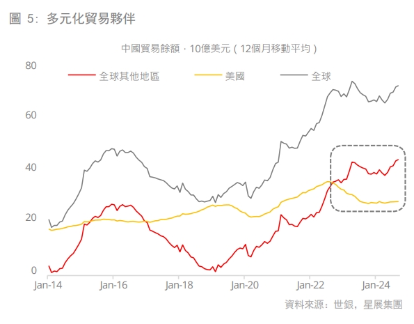 即使美國對中國的出口商品徵收關稅並限制其進口商品,中國仍成功實現貿易多元化,擴大了貿易收入來源,並降低了對單一市場的依賴。2022年底,中國與全球其他地區的貿易餘額已高於與美國的貿易餘額。