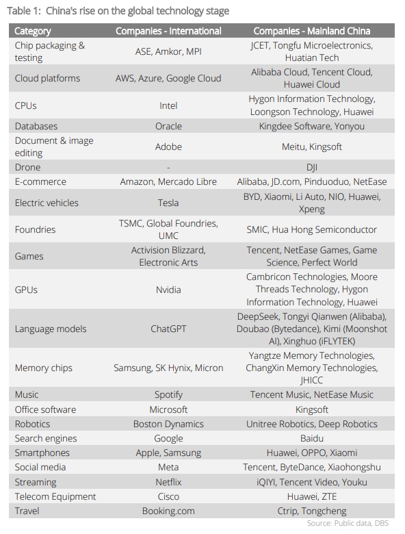 Chinese companies are making their presence felt on the global technological stage. As shown in Table 1, Chinese enterprises are present in nearly every major technological sector − from language models and cloud platforms, to semiconductor hardware and electric vehicles – as China commits to digital innovation, disruption, enablement, and adaptation.