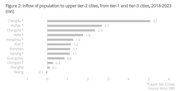 Population migration and the rise of upper tier-2 cities. The trend of population migration is closely linked to the rise of new upper tier-2 cities. Over the past few years, Chengdu, Wuhan, and Changsha have attracted a large influx of talent through appealing talent recruitment policies. These include housing subsidies, preferential treatment for high-technology entrepreneurs, and access to quality educational resources for families.