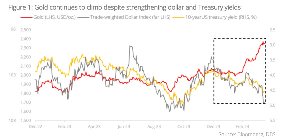 A surprise rally. The first two months of 2024 saw muted gold price movement, with bullion notching a marginal loss of -0.9% as at end February. This weakness, however, was short-lived as gold quickly rallied to a series of new record highs in subsequent weeks. As at 15 April, gold trades at USD2,353/oz., approximately 14.1% up year-to-date. This rally, while impressive, has left market observers puzzled as bond yields and the US dollar did not weaken nearly enough to warrant such a substantial rally. In fact, between 1 March and 1 April, the 10-year US Treasury yield and DXY index strengthened 8.9% and 2.0% respectively; gold rallied 13.0% during the same period. This move affirms our view that the inverse relationship between gold, and Treasury yields have indeed weakened substantially. With gold’s recent moves seemingly driven by factors outside of the dollar and Treasury yields, analysts have been left divided on what is responsible for this recent sudden spike in gold price.