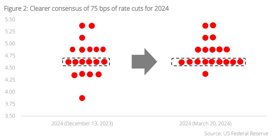 US macro data mixed, but rate cut bets are still on. On the US macro front, data points have been mixed, ISM manufacturing PMI showed a larger-than-expected contraction in February, falling to 47.8 from 49.1 in January. Non-farm payroll figures also showed vulnerability after December and January numbers were revised downward by a collective 167,000 jobs. On the other hand, inflation has proven sticky, with the headline figure rising to 3.8% y/y in March. While the macro data has been ambiguous, minutes from the latest Federal Open Market Committee (FOMC) meeting in March showed increasing conviction to implement rate cuts this year. The 2024 year-end median Fed Funds Target remained at 4.6%, unchanged from the December 2023 meeting, but the distribution of votes has converged towards a clearer consensus; nine of the FOMC participants indicated 4.50-4.75% to be the appropriate target range for the federal funds rate, up from six participants during the December meeting. In short, rate cut bets are still firmly on the table this year, which is a positive thing for gold.