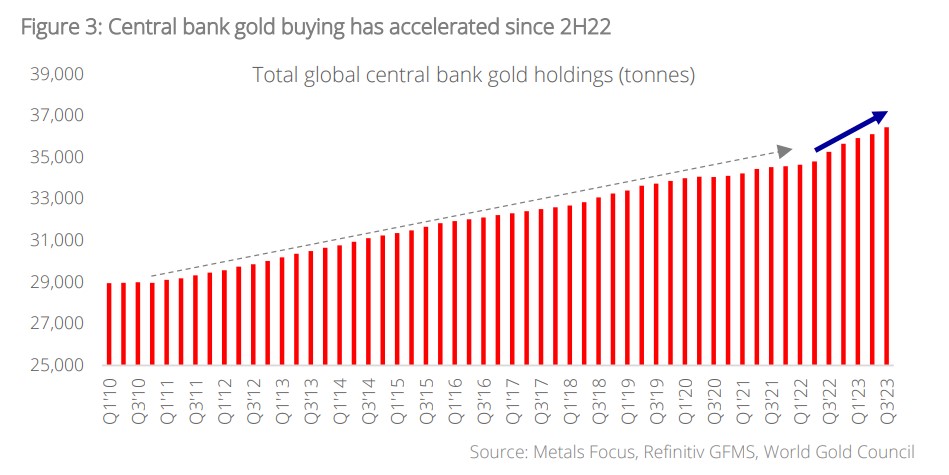 Central bank buying is a structural trend. While short-term factors like geopolitical risk and the trajectory of US monetary policy are pertinent in driving the price of gold, long-term factors are equally important as they provide a floor for prices. Case in point, central banks are price-sensitive buyers of gold, and as such, when gold experiences periodic sell-downs, it is not uncommon for some of them to partake in opportunistic buying, which will in turn help to support the gold price. Furthermore, central bank buying in general has picked up noticeably since 2H22, with total demand in 2022 and 2023 both exceeding 1,000 tonnes, which is significantly higher than the average annual demand of c.600 tonnes during the past decade. We expect this trend of elevated buying to persist as de-dollarisation gains momentum and central banks continue to shift their preferences towards real assets that are not at risk of sanctions or subject to cross-border custodial arrangements. The progressive deterioration of the inverse correlation between gold and rates supports the conjecture that the increase in central bank buying is more structural than cyclical, and will likely persist.
