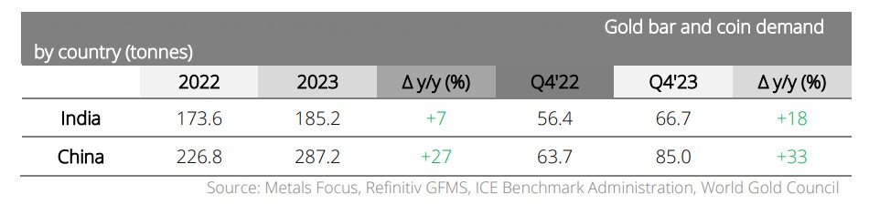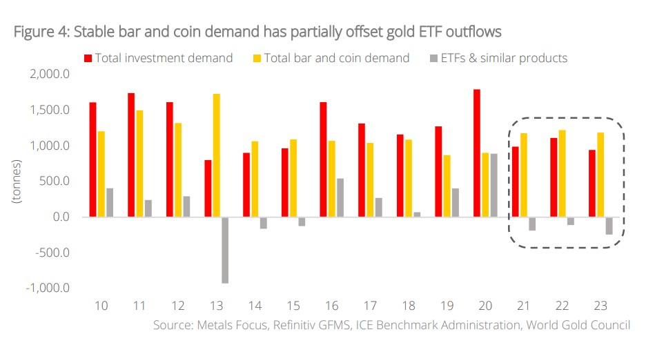 No ETF flows? No problem. Bar and coin demand to the rescue. While there has been a lot of focus on the sustained outflows for gold ETFs in the past three years, and how that has been a headwind for gold, we might be missing the forest for the trees here. Despite redemptions from gold ETFs from 2021 to 2023, investment demand for gold has held steady thanks to robust bar and coin demand. This was especially true for India and China, which saw bar and coin demand increase 7% and 27% respectively on a y/y basis. The allure of physical gold is not limited to central banks; private investors are also increasing their purchase of the precious metal. The shift towards privacy and tangibility has made many investors consider physical gold over ETFs, which lack privacy and anonymity since ETF transactions are recorded and holdings registered. Counterparty risk is also another problem that is solved by holding physical gold.