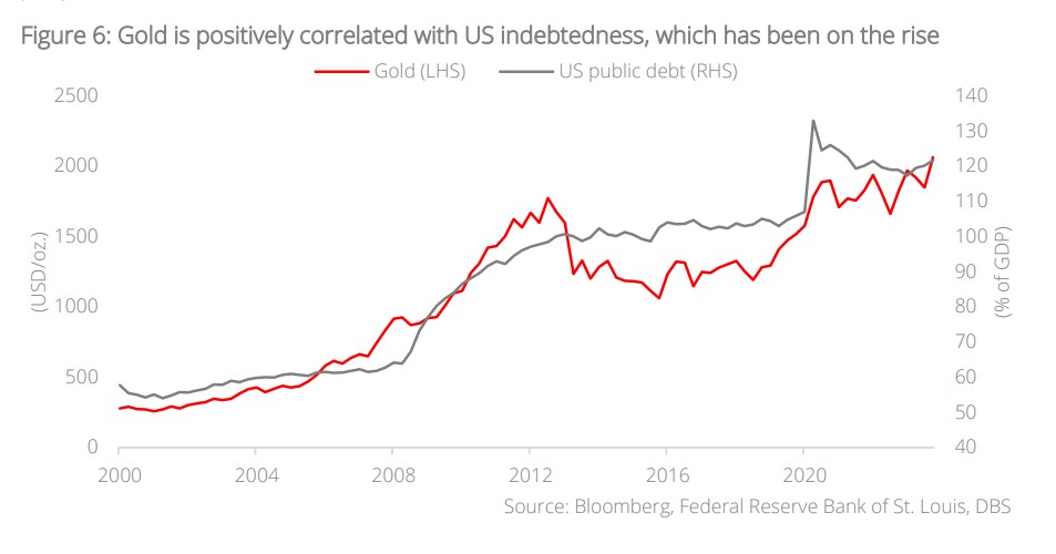 Geopolitical risk a key short-term driver. In the past, a gold rally as significant as this will usually be accompanied by a clear catalyst or risk event. This time however, reasons have been more ambiguous. Several factors have been postulated for the recent rally, including safe haven demand as well as weakening US macroeconomic data. On safe haven demand, the protraction and escalation of the long-standing Russia-Ukraine war and the Israel-Hamas conflict continues to boost the allure of gold as a hedge against geopolitical risk. With Iran entering the fray in the Middle East, geopolitical risk premiums for gold will likely rise moving forward.