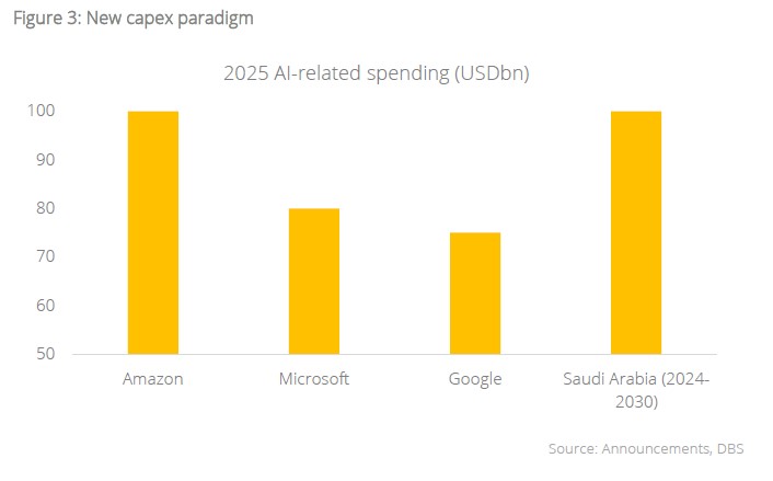 All is not lost.Hope is far from lost for the semiconductor industry as AI is igniting a powerful new wave of investment. Nvidia alone is committing USD500bn to build out onshore AI infrastructure, while the top three hyperscalers—Microsoft, Amazon, and Google—plan to invest a combined USD250bn in 2025 on AI infrastructure, data centres, chip procurement, and next-gen algorithms to drive ecosystem growth (Figure 3).