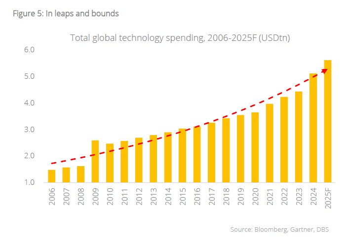 Robust total addressable market points to a bright future. The global semiconductor market is projected to hit USD1tn by the end of the decade, growing at an annual rate of 29% (Figure 4). On a larger scale, global tech spending is set to exceed USD5tn this year, surpassing the entire economy of Germany (Figure 5).