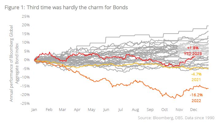 It was supposed to be the year for Bonds.Investors entered 2023 with no shortage of reasons to be risk-averse, with (a) the US Federal Reserve maintaining its hawkish push even after a 50 bps hike in Dec 2022, (b) early signs of cracks in the mid-sized banks nursing deep paper losses on their balance sheet yield-assets, and (c) no signs of an only did the Fed raise rates by another 100 bps, several banks on both sides of the Atlantic failed, and a new front of war developed in the Middle East. Moreover, recessionary expectations in 2023 rose to the highest levels since the onset of the Covid pandemic. Just on these developments alone, one would have thought that Bonds would have been the standout performer for the year.
