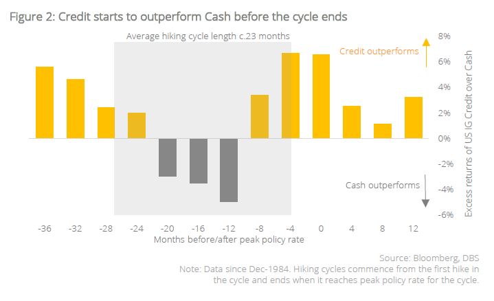 Cash has already had its day. We looked at performance data since 1984 comparing the 1Y forward excess returns of US IG Credit over Cash both before and after the policy rate peaks. What we noticed is that Cash is the better bet early in the hiking cycle – 12 to 20 months before the pause. However, investors need not wait for rates to peak before Credit starts to outperform. This is because markets usually move in advance of the policy cycle; funds flow before the end of the policy cycle in order to lock in higher yields for longer. Our analysis shows that Credit outperformance can even begin as early as four to eight months before the cycle ends. Having seen cash returns surpass Credit in 2022-2023, following a typical cycle implies that outperformance in Credit is no longer difficult to achieve from 2024 onwards.