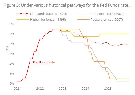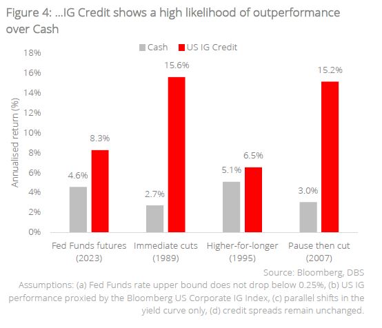Performing a scenario analysis with various rate trajectories. No doubt, the choruses of “higher-for-longer” raise the notion that yields on Cash may still offer a compelling alternative to Bonds for a long while to come. As such, to anticipate the performance of Credit vs Cash in the years ahead, we projected the possible pathways of the Fed Funds rate over the next three years under four scenarios mimicking historical episodes, including the pathways of (a) immediate cuts – following the 1989 pause, (b) higher-for-longer rates – mimicking the 1995 pathway, (c) pause then cut – such as in 2007, as well as (d) using the current Fed Funds futures projections. We then compared the expected annualised returns of Credit vs Cash based on the anticipated yield movements.