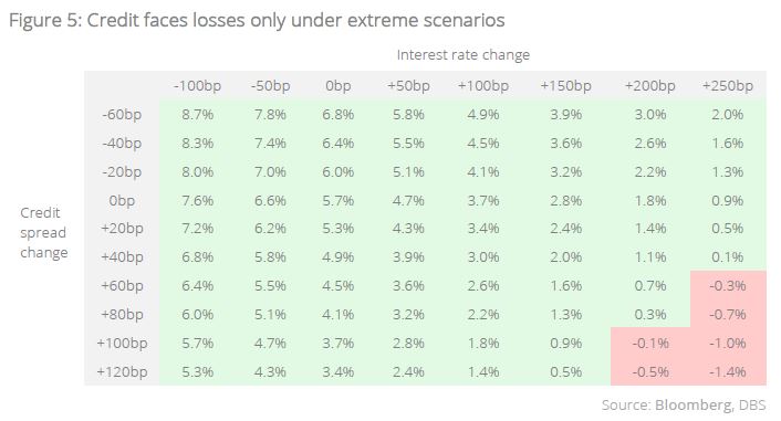 Credit also performs well under stress testing. With much uncertainty around the investment climate, investors may still feel that taking neither duration nor credit risks in Cash is preferred, given that return of capital is now a greater priority than return on capital. However, given that starting yields on broad swathes of the short-duration high-quality credit markets are now yielding close to 6%, it would take very extreme cases of rate rises and/or spread widening for an investor to end up with losses over a one-year horizon.