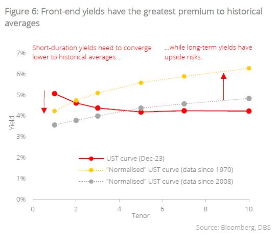 Under both instances, the “normalised” yield curves are upward sloping, and it is interesting to note that front-end yields are still much higher than historical averages, while longer-term yields could see more upside risk should mean reversion occur. The sweet spot for duration seems to remain in the 3-5Y segment of the curve.