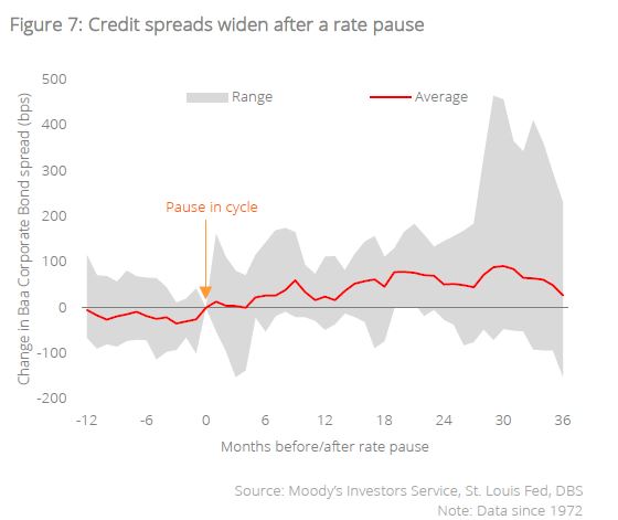 Take caution on credit risks. Investors should also remain cautious with credit risks following a rate pause. While it is intuitive to think that headwinds should abate after a pause in the cycle, the data seems to suggest that credit risks can accumulate beneath the surface even after a peak in rates. Looking at aggregate spread data since 1972, we note that credit spreads on average continue to widen after the pause, likely due to stresses in companies adjusting to higher funding costs and tighter lending conditions. This leads us to continue to favour IG over HY for 2024, with the A/BBB segment remaining the sweet spot for Credit.