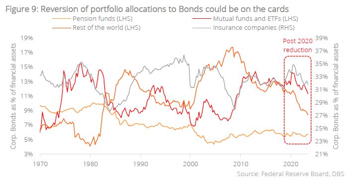Bond allocations could turn favourable in 2024. Finally, a structural tailwind for Credit could come in the form of revised portfolio allocations from real money accounts around the world. We note that asset managers have been reducing portfolio allocations to Bonds in the low-yielding post-pandemic years. The sharp rise in yields post hiking-cycle could see higher allocations and overweight calls return for Fixed Income, resulting in a tailwind of fund flows in support of Bonds at the turn of the year.