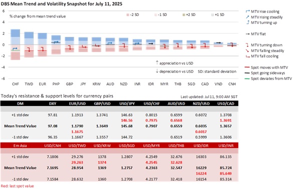 Next week’s US CPI release, scheduled for July 15, will be pivotal for the USD. The better-than-expected US jobs report on July 2 was significant in dashing hopes for an earlier Fed cut at the July 30 FOMC meeting, lifting the DXY Index off its 3-year low of 96.4 towards 98 this week. A similar surprise in CPI could push the DXY into its prior month’s 98-100 range. Consensus expects CPI inflation to accelerate to 2.7% YoY (0.3% MoM) in June from 2.4% YoY (0.1% MoM) in May, with core inflation rising to 3% YoY (0.3% MoM) from 2.8% YoY (0.1% MoM).