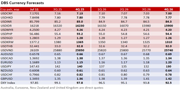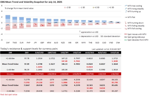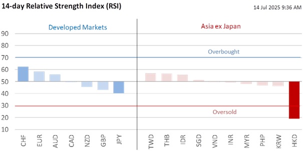 We pay more attention to GBP/USD’s downside risks this week. Following its 1.7% depreciation in the first fortnight of July, GBP/USD could extend its decline below the crucial 1.35 support level towards 1.3250, around its 100-day moving average. The OIS market is pricing an 85% chance for the Bank of England BOE to lower rates at its August 7 meeting. Last week, UK GDP growth turned negative month-on-month for a second consecutive month in May. The Atlanta Fed GDPNow model expects US advance GDP growth to rebound to an annualized 2.6% QoQ saar in 2Q25 after a 0.5% contraction in 1Q25. This week, UK CPI inflation out on July 16 could halve to 0.1% MoM in June from 0.2% in May, keeping headline inflation unchanged at 3.4% YoY. On July 17, average weekly earnings are expected to slow for a fourth straight month to 5% YoY in May from 6.1% high in December.