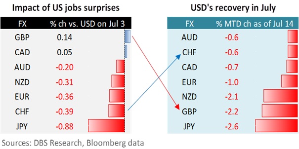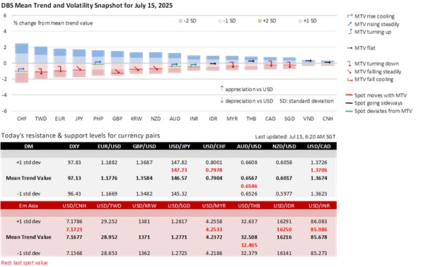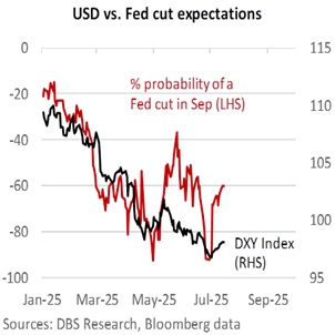 The better-than-expected US jobs report on July 3 started the USD’s recovery this month by dashing expectations of an earlier US rate cut in July. As of July 14, the DXY Index has appreciated by 1.2% to 98.1 this month following its worst half-yearly plunge of more than 10% since 1973. A similar upside surprise in CPI could extend the DXY’s recovery by affirming Fed Chair Jerome Powell’s view that tariffs would lift inflation in the coming months. His case is reinforced by Trump’s latest threat to impose higher reciprocal tariffs on August 1 for countries that fail to strike trade deals with the US.