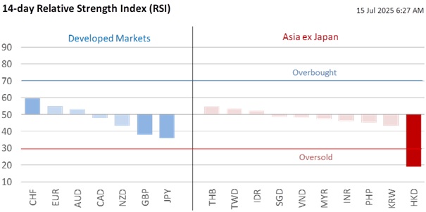 The JPY continued to underperform as markets priced in the risk of the ruling LDP-Komeito coalition losing its majority in the July 20 Upper House elections. Such an outcome could add to JGB volatility amid expectations for more expansionary fiscal policy and political resistance to further interest rate normalization by the Bank of Japan amid difficult trade talks with the US for concessionary tariff rates. Hence, it should not be a surprise that the CHF has enhanced its safe appeal in recent weeks, partly filling the gap left by the JPY’s underperformance.