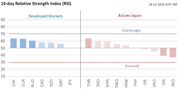 EUR/USD appreciated for a fourth day by 0.1% to 1.1770 overnight, retracing more than 75% of its decline to 1.1555 from 1.1830 over July 1-17. The market is overwhelmingly in favour of the European Central Bank holding rates at today’s governing council meeting. The ECB has cut rates eight times since June 2024, halving the deposit facility rate to 2% last month, at the mid-point of its 1.75-2.25% neutral range. ECB President Christine Lagarde will likely reiterate the June framework, which stated that decisions will be “meeting-by-meeting” and guided by incoming data.