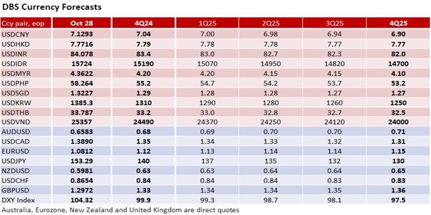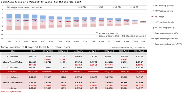 Markets should look past tomorrow’s US advance GDP growth for 3Q24, which is expected to stay at the same pace as 3Q24 at an annualized 3% QoQ saar. The Fed’s Beige Book noted that US economic activity has changed little across most districts since early September, contrasting with recent positive economic data. The report also cited cautious consumer spending because of the uncertainties surrounding the US Presidential elections on November 5. With bond yields some 50 bps higher this month, consensus may be too optimistic in expecting today’s Conference Board’s consumer confidence index to improve to 99.5 in October from 98.7 in September.