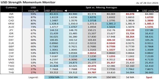 The greenback has not been responding to rising US bond yields. First, the futures market has priced in two Fed cuts in November and December, which would lower the Fed Funds Rate to 4.25-4.50%. if so, this should cap the rise in the 2Y and 10Y yields, which closed overnight at 4.14% and 4.28%, respectively. Additionally, WTI crude oil prices plunged 4.4% on Monday to USD68 per barrel, reversing the spike to USD77 in early October driven by fears of a broader Israel-Iran conflict.