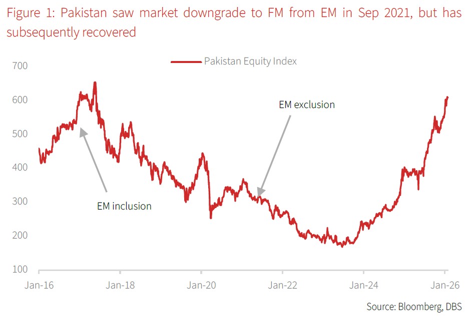As an illustration, the most recent example of an EM to FM downgrade was with Pakistan in Sep 2021. The decision was driven by the Pakistan equity market no longer meeting the minimum size and liquidity standards for EMs, following a previous promotion to EM status in 2017. Pakistan’s equity market experienced a significant decline by 13% over a month. However, the equity market has seen a remarkable recovery, more than tripling in value since 2023. This robust performance is largely attributable to the nation's successful economic turnaround from its 2023 crisis. Key factors underpinning this recovery include the securing of IMF programs, the implementation of stringent fiscal and monetary policies to combat high inflation, and the subsequent stabilisation of its currency.