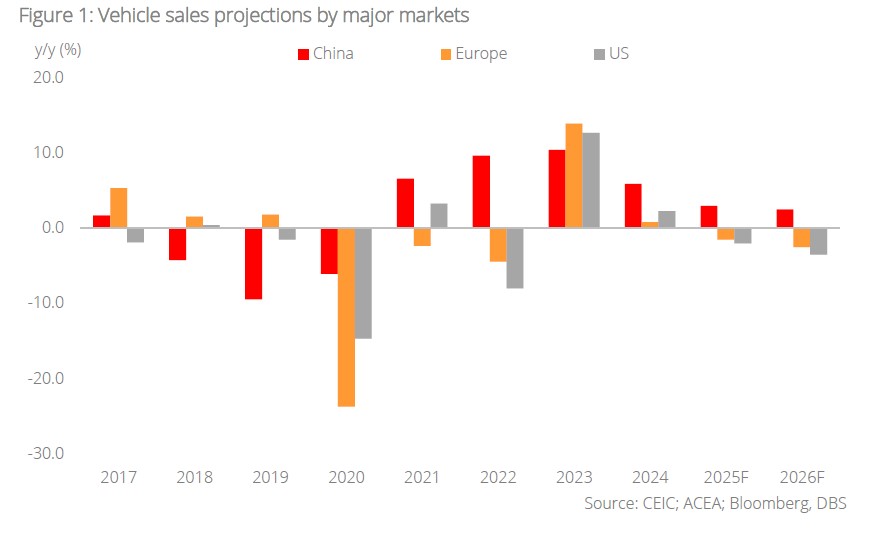 Major vehicle market shipments to slow in 2H as disruption deepens. Global auto supply chain disruptions are expected to intensify in 2H25, especially as the US concludes further trade negotiations. US consumers are likely to adopt a wait-and-see approach amid uncertainty surrounding trade policy, new vehicle prices, and model availability. New vehicle inventory in the US fell to 2.6mn units in May (average of consensus). Hence, full-year new vehicle sales in the US are projected to reach approximately 15.5mn units (seasonally adjusted) in 2025, representing a 2.5% y/y decline, while Europe’s sales are forecasted at about 12.7mn, down c.2%, suggesting that the bulk of the decline will be concentrated in 2H25. On the other hand, China’s auto industry continues to show resilience, especially the NEV sector, which is projected to post a y/y sales expansion of 17% to about 9mn units, even as intense price competition persists.