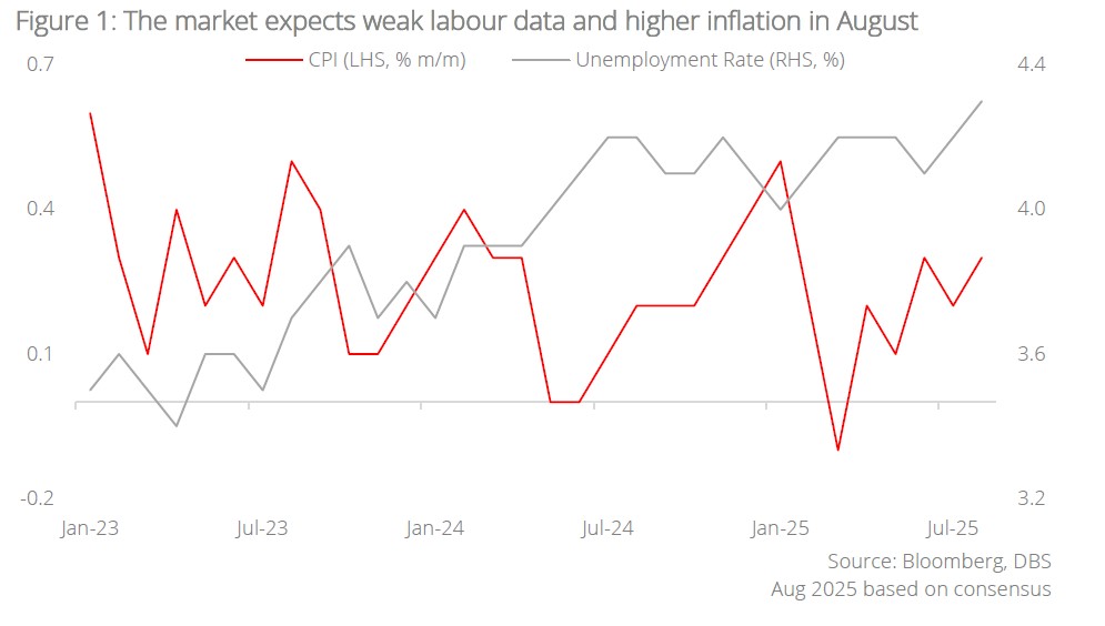 The market consensus expects August nonfarm payrolls to remain below 100k and unemployment rate to rise to 4.3% from July’s 4.2% for the first time since Oct 2021. Mirroring the nonfarm payrolls, US JOLTS job openings fell to 7181k in July, lower than the 7380k consensus. June was revised lower to 7357k from 7437k. The labour market’s softness was also reflected in the Fed’s Beige Book which reported little to no change in economic activity across most of the 12 Fed districts. Business contacts reported raising prices to partially offset the impactful tariff-related price increases in inputs. Many households felt the pinch of wages as these did not keep up with rising prices, implying weaker consumer spending and lower growth expectations. Hiring slowed with businesses hesitant to fill in vacancies or bring in new staff with some turning to automation and AI instead.