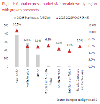Despite headwinds in the broader logistics market from the evolving global trade dynamics, the global express market is well-positioned to sustain robust growth. The sector is projected to grow at a 7.9% CAGR in 2025-2029F, following an elevated 8.8% y/y in 2025F. This momentum is primarily driven by the robust B2C segment, which is projected to grow at a substantial 10.8% CAGR (vs. a sluggish 2.5% CAGR for B2B segment). Notably, the Asia Pacific region is expected to serve as a key engine with a strong CAGR of 10.5% in 2025-2029F (vs. 6.0%/5.9% CAGRs from North America and Europe). The region is expected to consolidate its position as the largest contributor at 45% of global market by 2029F (vs. 33%/17% from North America and Europe).