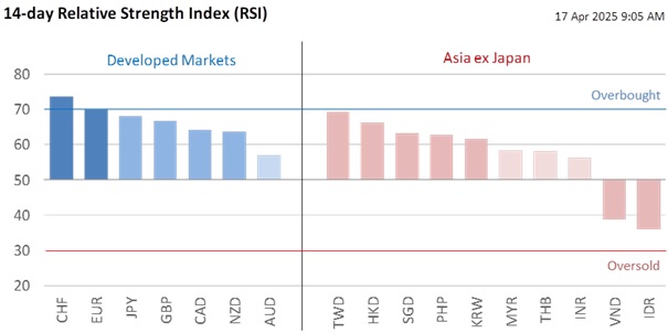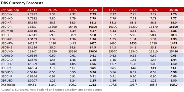 Despite the DXY Index’s 1% fall to a three-year low of 99.26 overnight, we are cautious and mindful that the DXY has yet to break below the intra-day low of 99 seen on April 11. Unlike last week, no de-dollarisation fears were inferred from investors dumping US Treasuries while exiting US equities. Yesterday, investors sought safety in bonds, driving the US Treasury 10Y yield lower a third day by 5.6 bps to 4.277% amid the 2.2% decline in the S&P 500. Markets may reverse again before US stock markets close on Good Friday; the US bond market will close early today in observance of Maundy Thursday.