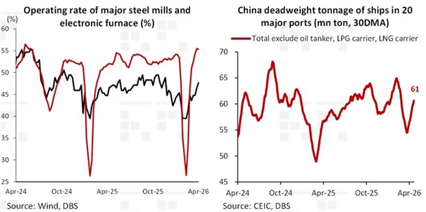 Second, external activity shows early signs of improvement. Port throughput across 20 major ports rose 5% in April mtd versus March, while international cargo flights edged slightly higher, indicating a gradual recovery in trade-related momentum.