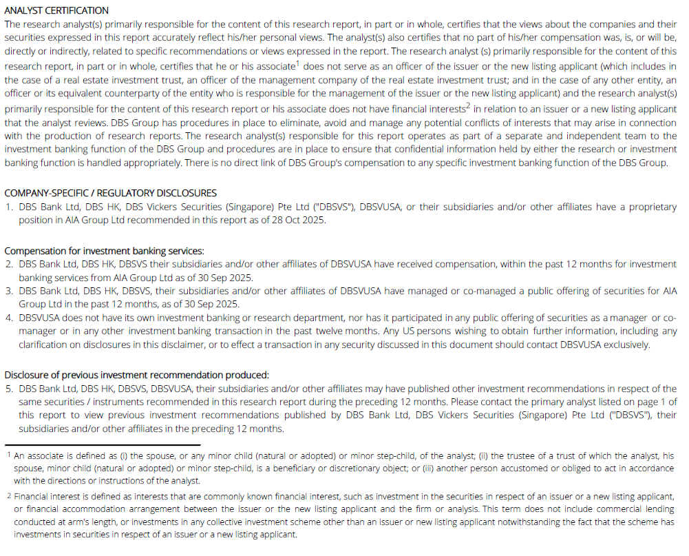 Maintain BUY, TP unchanged at HKD100. AIA maintained a solid and diversified investment portfolio, with the average credit rating of its bond portfolio at A and only 2% rated below investment grade or not rated. In China, 80% of non-par funds were invested in bonds, of which over 90% were government and agency securities with stable average ratings at A. This prudent asset mix supports AIA’s strong capital position and limits exposure to credit market volatility. Maintain BUY with TP HKD100, as long-term growth drivers remain intact, supported by China’s geographic expansion and the reacceleration of the agency channel since 2Q, reflecting AIA’s strong execution and product capability.