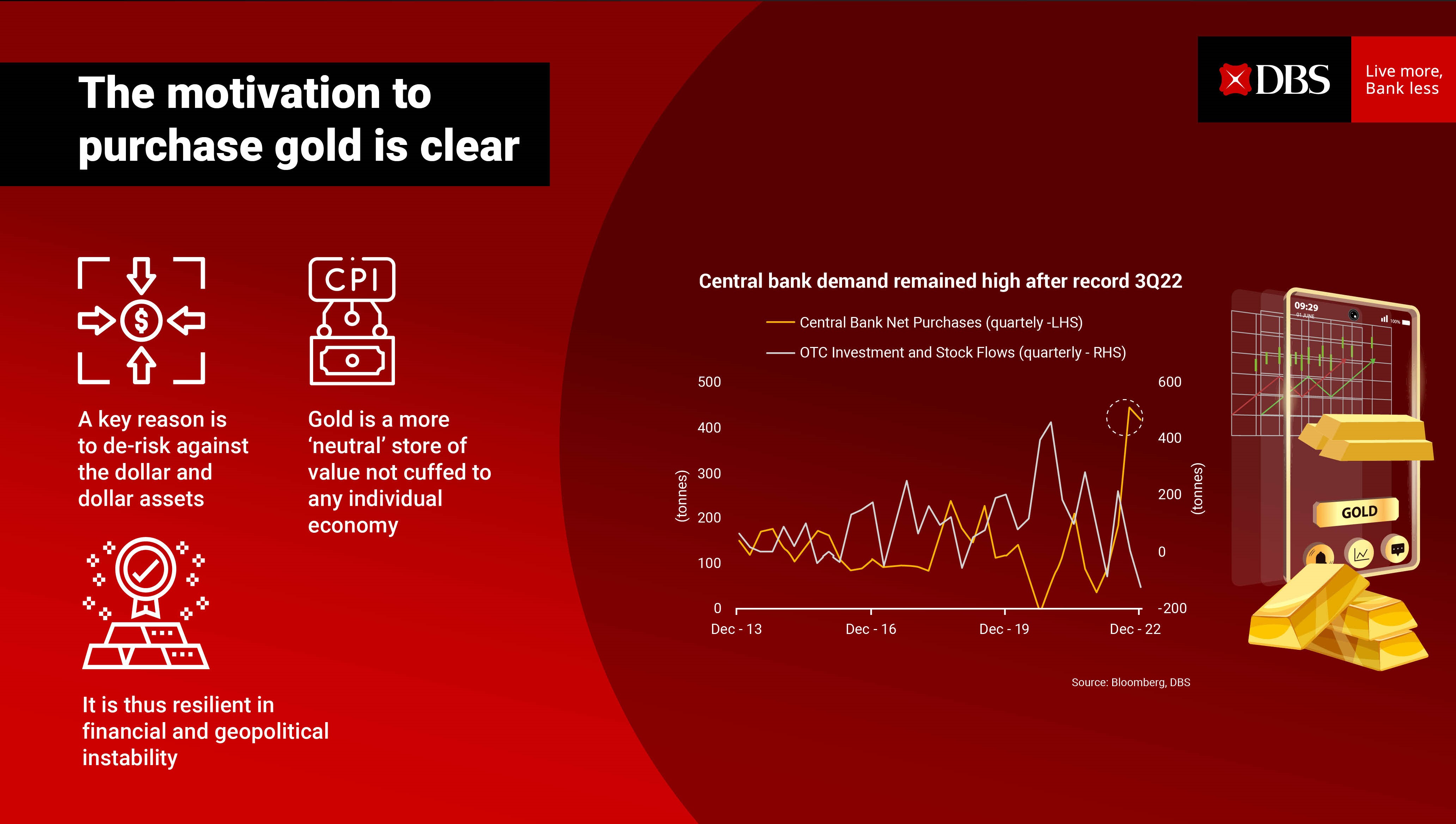 China joins the list of countries that are stocking up on gold, with the PBOC announcing yet another increase in its gold reserves in January. This trend of increasing central bank buying has been going on since late last year, peaking in 3Q22 at a record high of 400 tonnes. The motivation is multi-fold but one of the key reasons is to de-risk against the dollar and dollar assets as gold is a more 'neutral' store of value that is not cuffed to any individual economy, and gold is also resilient in geopolitical and financial crises.