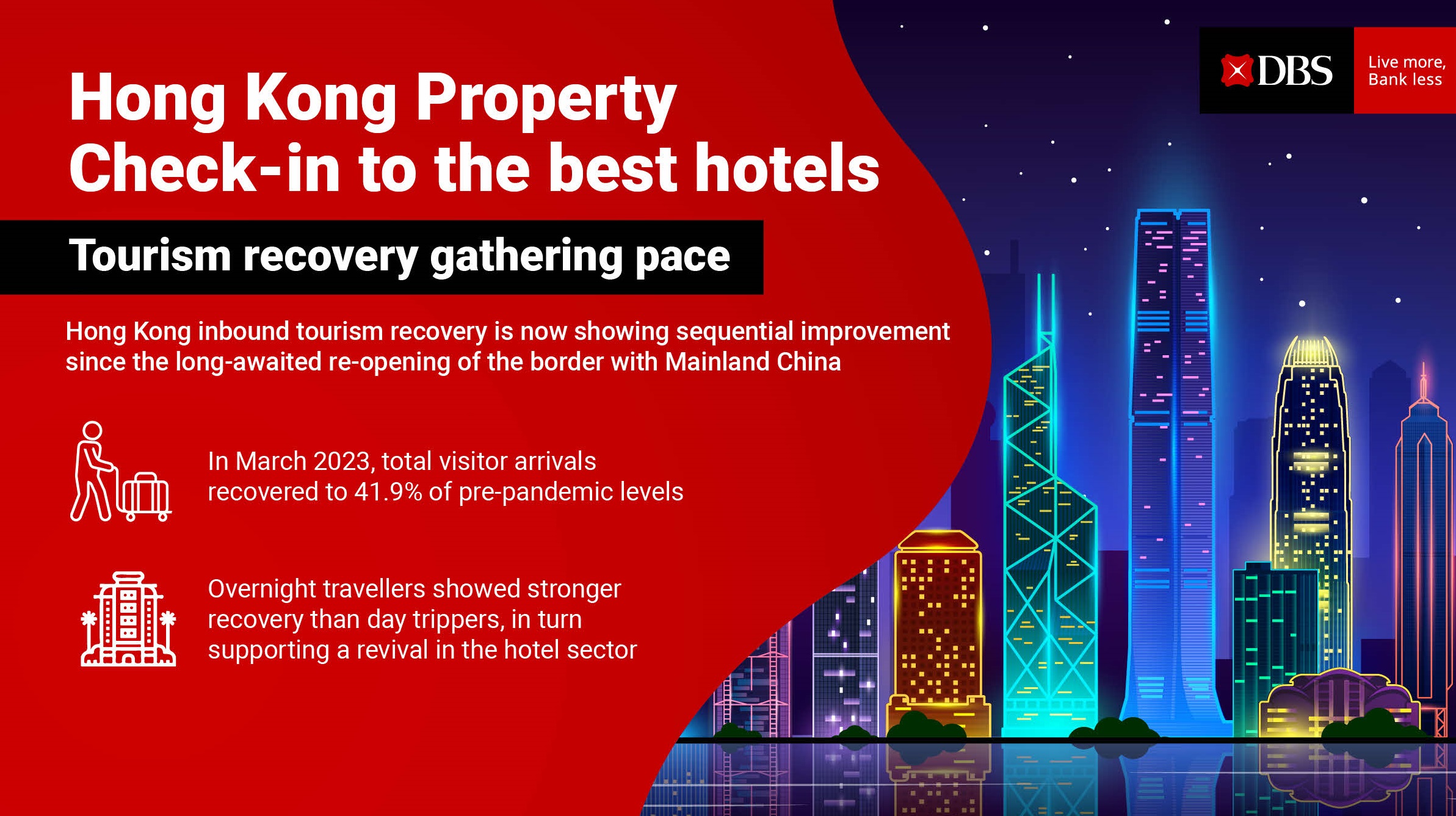 In March 2023, total visitor arrivals recovered to 41.9% of pre-pandemic levels. Overnight travellers surpassed day trippers, in turn supporting a revival in the hotel sector.