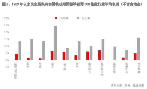 行業(不含房地產)表現部份,1989年以來,在民主黨執政期間,表現最好的是科技(約24.7%),其次是醫療保健(約16.2%)和金融(約15.3%)。在共和黨執政期間,表現最好的是非必需消費(約7.1%),其次是科技(6.5%)和必需消費品(約6.2%)。值得注意的是,無論哪個政黨執政,科技行業都表現強勁。