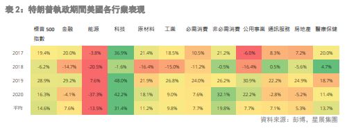 相反地,特朗普執政期間表現最好的是科技和非必需消費行業,平均年度回報率為分別為31.4%和19.8%。