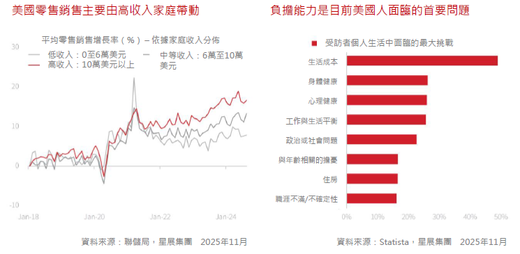兩極分化的世界:富人與窮人。這不是正常的時期。2025年是美國聯儲局(Fed)在通脹頑固地維持在2%以上的情況下依舊進行減息的一年。這也是特朗普政府在美國財政和債務危機正在惡化的情況下, 透過“ 大而美法案( One Big Beautiful Bill Act)”繼續大開財政水龍頭的一年。忘記通脹目標 – 任何盈餘的財政保守主義概念都已被拋諸腦後。慷慨的財政和貨幣政策現在主導一切,帶動標普500指數創下新高,其中AI相關行業亦繼續錄得不錯的表現。從投資者的角度來看,市場氛圍良好且流動性充裕,市場能有什麼問題呢? 然而,目前的經濟數據無法解釋全貌。美國消費 看似具有韌性,但這個宏觀經濟數據卻不成比例 地由受惠於股市繁榮的高收入者所影響。同樣地,