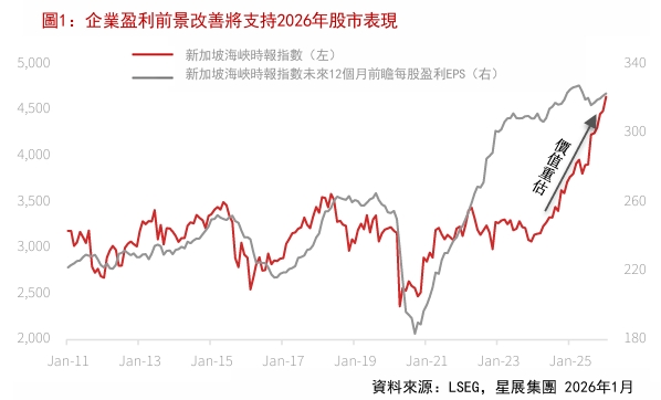新加坡2025年實質GDP強勁增長4.8%,星展集團預期新加坡經濟將在2026年展現穩健的韌性,並維持約1.8%的增長速度。在較低的利率、更為溫和的貿易環境以及全球人工智能相關資本支出持續增長的支撐下,企業盈利可望持續改善。星展集團預測,在2026財年盈利增長8%的推動下,海峽時報指數(STI)將在2026年底達到4,880點。