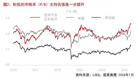 結構性流動性利好。 2026年流動性狀況可望進一步改善。計劃於2026年中期左右推出的新加坡交易所 - 納斯達克雙重上市機制將增強跨境資本准入,並可能刺激IPO活動,尤其是在與美國和亞洲聯繫緊密的公司中。此外,50億新幣證券市場發展計畫(EQDP)中剩餘的10.5億新幣(20%)可能會在2026年第二季部署,並支持大型股和中小市值公司(SMC)的增量資金流入。