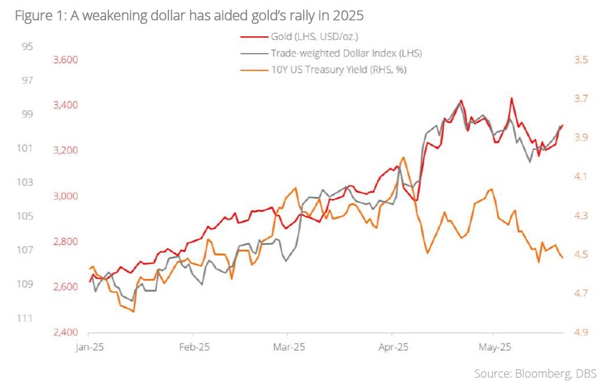 Running circles around analyst predictions. By now, it is well established that gold has been in a consistent bull market for the better part of the last three years. We have covered, in past publications – “Further Highs for Bullion as Trade War Fears Mount” (Feb 2025); “A Glittering Haven” (Apr 2025) – the various tailwinds for the precious metal. These include geopolitical uncertainty, a widening US fiscal deficit, de-dollarisation, and fiat currency debasement among others. For 2025, the clear consensus on the street was bullish gold, with upside far outweighing potential downside. Despite this, few could have predicted gold’s prodigious rally in April. It was as if gold had suddenly floored the figurative gas pedal and kicked into a higher gear, peaking at an intraday high of USD3,500/oz. on 22 Apr. Having said that, the key question remains: how high can gold go? The DBS CIO Office is revising our gold target price to USD3,765/oz. by 4Q25 (previously USD3,330 by 1Q26) against the backdrop of accelerating tailwinds under a changing world order.