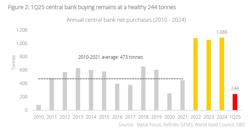Central bank and investor demand are key to gold’s continued rise. We have long opined that one of the key tailwinds for gold in this new era is central bank and investor gold buying on the back of geopolitical uncertainty and fragmentation. This not only provides a steady structural demand for gold in the long run, but also maintains a price floor and caps downside risk for the precious metal during times of broad de-risking, as was illustrated post “Liberation Day” in April. We performed a linear regression analysis (using quarterly data from 2017 to 1Q25) of the q/q change in gold price against the combined quarterly central bank and investment (bar, coin, and ETF) demand for gold, and found that it takes approximately 600 tonnes of quarterly demand to produce a quarterly increase of 6.4% in gold prices. This is one of the key assumptions underpinning our revised target price of USD3,765/oz. by 4Q25. The average quarterly central bank and investment demand for gold per quarter was roughly 500 tonnes from 2017 to 1Q25, and we believe that the assumption of demand increasing to an average of 600 tonnes per quarter is fairly justified given how: i) the geopolitical landscape has deteriorated under Trump, which will further spur central bank buying; and ii) gold as a percentage of international reserves remains at roughly 21% (as at Feb 2025), well below the historical 54-year average of 29%. On point (ii), the percentage falls drastically to 11% if US, Germany, France, and Italy (countries with the largest gold reserves) are excluded from the calculation, highlighting significant headroom for reserve diversification for central banks from other nations such as China, Poland, Turkey, Singapore, India, and others.