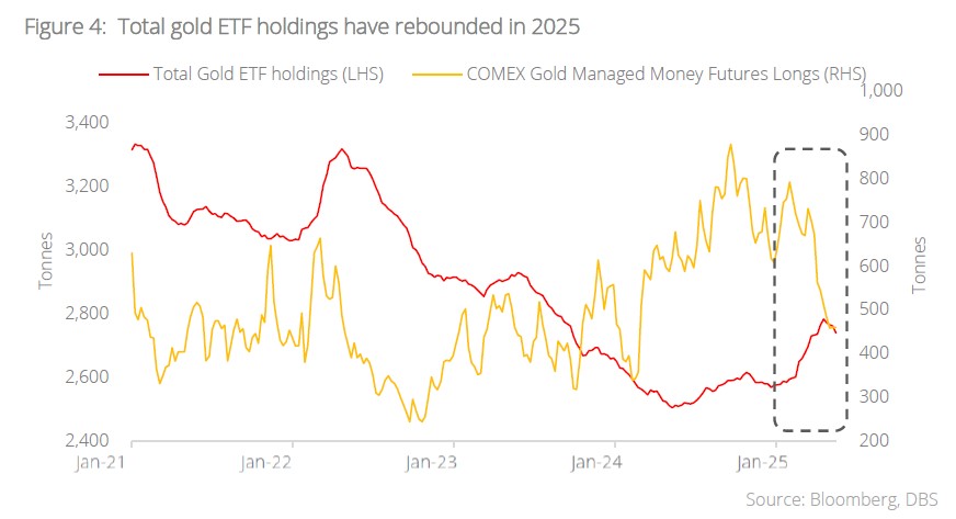 A sustained rebound in gold ETF demand. The favourable backdrop for gold has seen gold ETF demand rebound in 2025. ETF demand for 1Q25 was 227 tonnes, the highest it has been since 1Q22. This positive momentum continued as April saw a further 115 tonnes of ETF demand, the strongest inflow since Mar 2022, taking the total YTD demand to 342 tonnes. Despite the surge however, total gold ETF holdings remain 10% below the month-end peak in Oct 2020, suggesting that this rally still has room to run. In terms of regional flows, Asia and North America dominate on a YTD basis. Unsurprisingly, gold trading volumes also boomed in April by 48% on a m/m basis. This was for both OTC (LMBA) and exchange-traded (COMEX and Shanghai Futures Exchange) activities. Nonetheless, long positions held by money managers fell in April due to profit-taking amid record high gold prices.