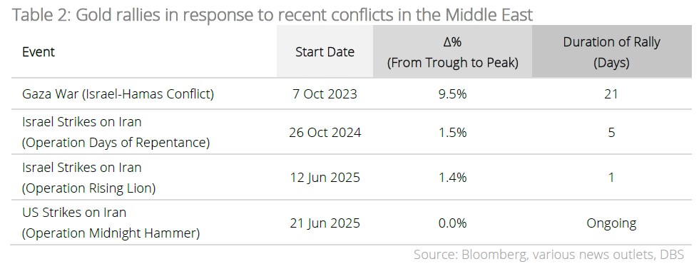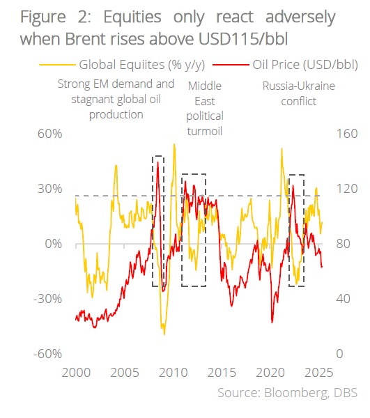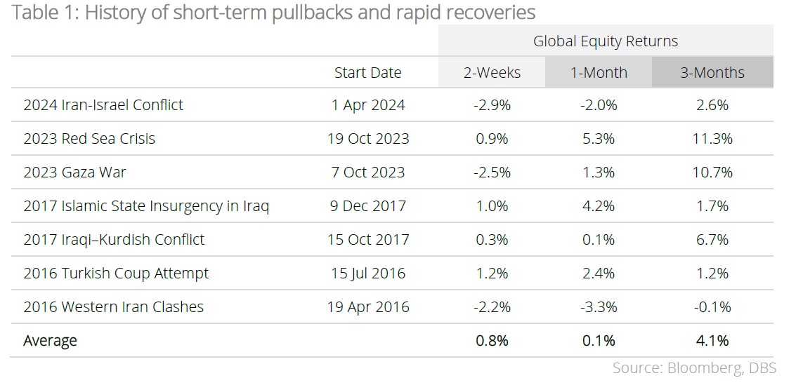 Past market selloffs on geopolitical shocks tend to be short-lived. Our analysis of past conflicts suggests that geopolitical shocks in the Middle East usually only result in short-term drawdowns with markets rebounding within weeks. On average, global equities fell c.0.8% in the first two weeks following major conflicts in the region, before rebounding c.4.1% on average after three months. In fact, global equities surged 11% three months after the Red Sea Crisis and Gaza war in 2023.
