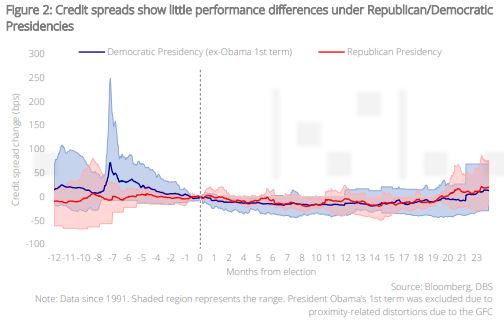 Elections themselves have limited impact on credit risk. Quantitatively, the first thing to note is that credit spreads show little variance between a Republican or Democratic presidency; an intuitive observation given that other factors (corporate balance sheet strength, profitability, monetary policy, liquidity etc.) have a larger and more direct influence on spreads. Interestingly, under both sides, spreads exhibit a tendency to decline in the 12 months after elections – likely as the markets are relieved of a key quadrennial risk event.