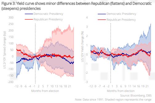 Presidencies and the yield curve. The yield curve however does seem to show slight differences – Under Republican presidencies, curves appear to flatten in the one-year period before and after elections, while democratic presidencies see steepening in the same timeframe. Once again, the data on average shows little discrepancy between Republican or Democratic presidencies, but it is interesting to note that the ranges can be quite variable – for example, the 10Y UST yield under Republican presidencies appear to inhabit a lower range of yields two years after elections, while the range under Democratic presidencies appears quite wide.