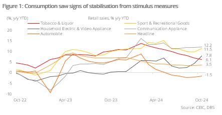 Retail sales growth accelerated from 3.3% y/y in the first nine months to 3.5% YTD in October as consumption sentiment saw signs of stabilising due to the stimulus measures. Spending on leisure, cosmetics, and household electronics surged by 26.7% , 40.1%, and 39.2% y/y respectively. However, a negative wealth effect from asset markets continues to dampen consumption sentiment with sales of big-ticket items, luxuries, and construction materials declining further. Hopefully, the CNY300bn consumption upgrade subsidy, equivalent to 0.6% of retail sales, will cushion the downtrend.