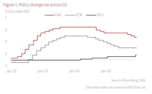 G3: Risks lurking underneath the US economy; policy divergence across G3. On the surface, the US economy has entered the final leg of 2025 with considerable strength. As per Atlanta Fed’s Nowcasting analysis, economic growth momentum is currently the highest seen this year. Durable goods orders, manufacturing PMI, retail sales, non-residential investment, and public spending trends point to above-trend GDP growth in 3Q25 and possibly in 4Q25. Our 2025 GDP growth forecast of 1.9% is characterised by substantial upside risk. The Fed may not be ultra-dovish (yet), but the market is confident that the path ahead includes lower rates and ample liquidity. But is the outlook paved with nothing but comfort? We are picking up several clues that suggest potential headaches ahead. First, labour market developments could pose risks to the consumption outlook. Second, financial sector stability issues could resurface in 2026. Lastly, inflation. Cost-of-living concerns dominated this year’s off-cycle elections and are unlikely to fade, especially if the Fed errs by keeping policy too loose. From tariff passthrough to immigration tightening that raises labour costs in services and construction, inflation could climb well past 3% and spoil the party in 2026.