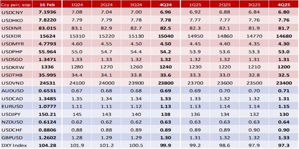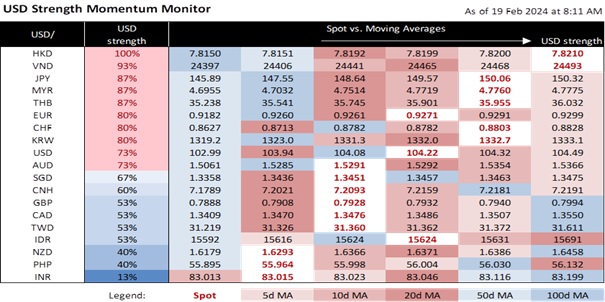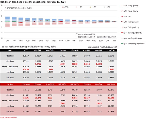 DXY appreciated by 0.2% to 104.28 last week, closing above its 100-day moving average for the first week since mid-November. Fed officials are adhering to their forecast of three rate cuts in December’s Summary of Economic Projections. The US calendar is light in terms of data, focusing mainly on Fed events, especially the FOMC minutes on 21 February. Seven Fed officials are scheduled to speak on Wednesday-Friday. They are Vice Chair Philip Jefferson, Governors Michelle Bowman, Lisa Cook, and Christopher Waller, and Presidents Raphael Bostic (Atlanta), Patrick Harker (Chicago), and Neel Kashkari (Minneapolis). Unless they sound overly hawkish, Fed officials have already pushed back against the market’s aggressive rate cut bets. Since mid-December, interest rate futures have pulled back their stakes from seven to four cuts this year, and for the first reduction to start in June instead of March.